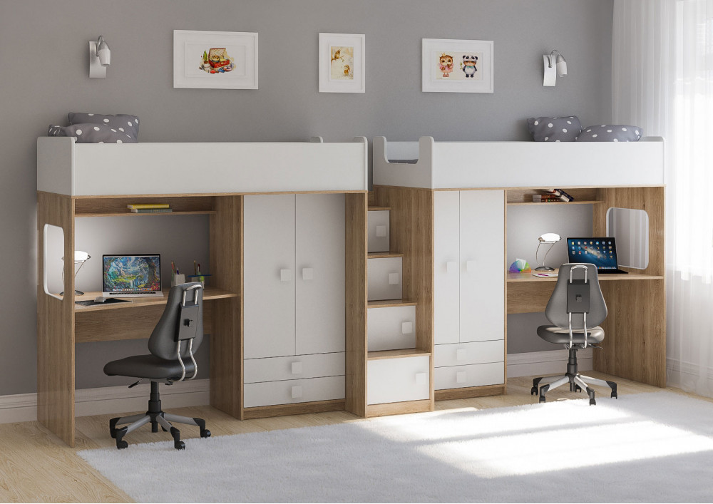 Две кровати, два шкафа, две игровых зоны – одна лестница. Идеальный вариант для двоих детей!