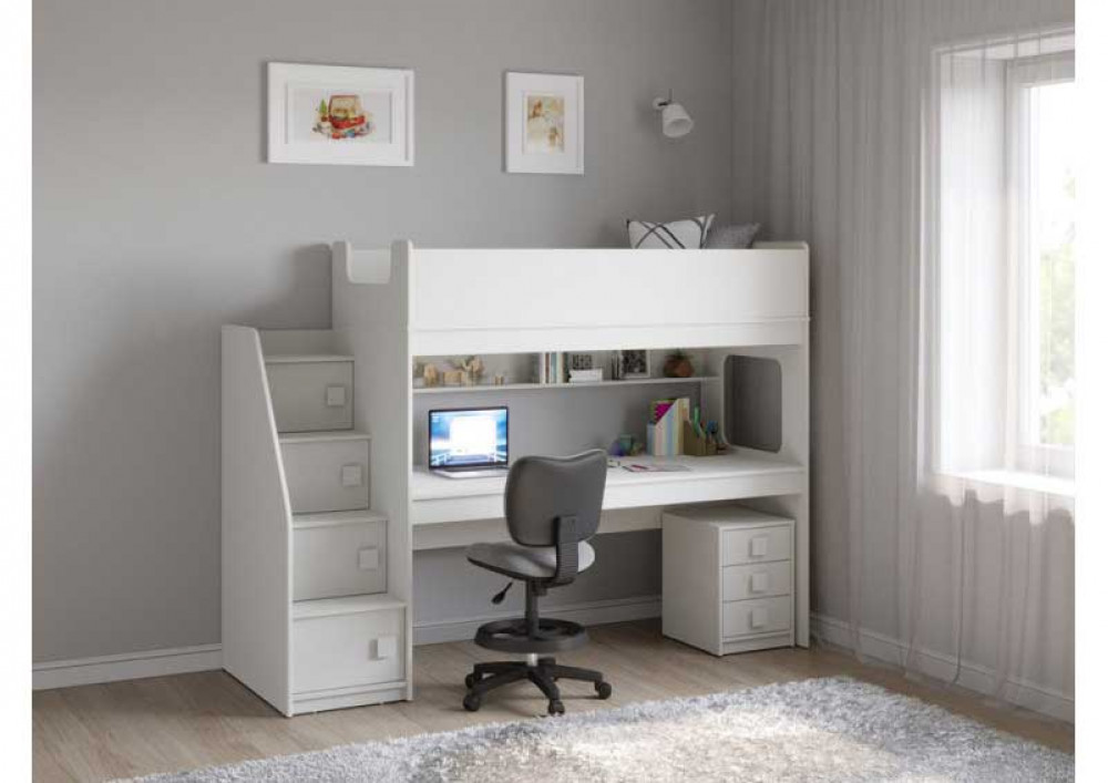 Учебная зона со столом под спальным местом открывает возможности для письменных работ,а также здесь удобно расположить ноутбук, а вместительная тумба поможет в хранеии канцелярских принадлежностей и учебников.