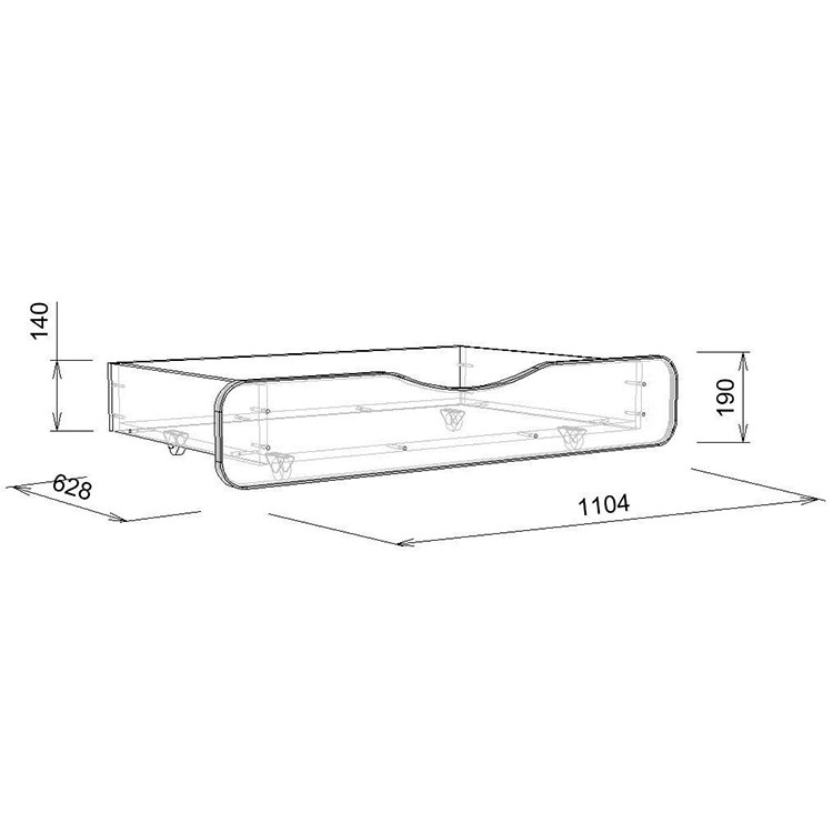 Ящик Л-07 размером 1104х628х200 отлично помещается под нижний ярус,удобно выкатывается и закатывается,так как оборудован колёсиками.Ящик – лучшее решение в организации хранения игрушек,белья или иных вещей.